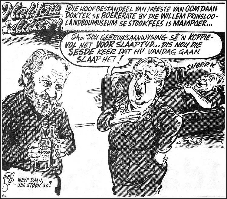 Daar is niks wat 'n sluk terpentyn of brandewyn nie kan oplos nie (selfs al is jy swanger). 'n Stewige dosis peroksied doen wonders vir stinkasem. Slangbyt? No worries: “Drink dadelik brandewyn so dikwels dat jy naar word. Sit 'n kooltjie vuur op die bytplek en hou aan totdat die vuur nie meer doodgaan nie. Neem ’n lewende hoender en sny ’n klein snytjie voor die bors. Druk dan die snytjie teen die bytplek en hou dit vas tot die hoender doodgaan. Herhaal indien nodig.”